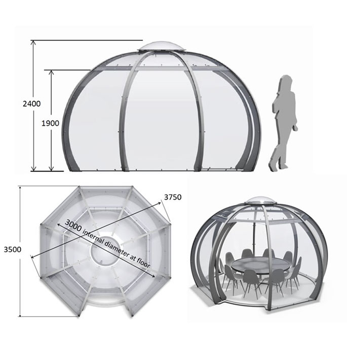 Our original classic pod is 3m diameter and offers the perfect dome shape for up to 10 people with one table and chairs or more relaxed seating.